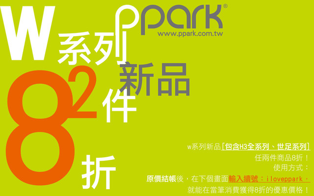 ppark現在針對w新品,包括H3第一代、世足系列,任意搭配兩件以上,都打8折喔!