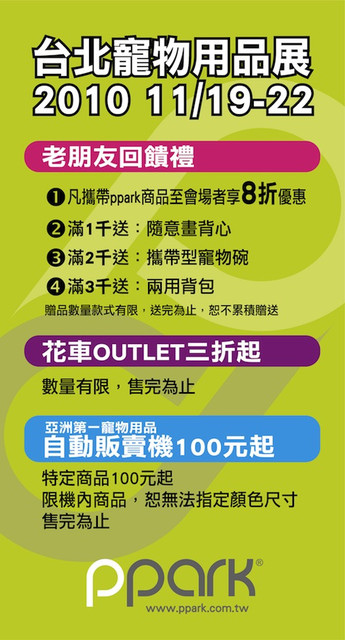 Outlet三折起 即將在世貿三館登場 年終最後搶購機會 還是那句老話 該請假的記得去請假 進場後記得直奔ppark攤位!